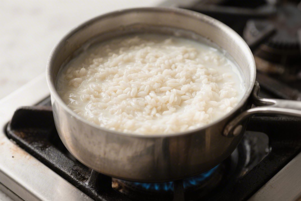 - Lower the heat and cook slowly: Once it reaches a simmer, reduce the heat to low. Cook uncovered, stirring every few minutes, for 25–35 minutes. Keep the mixture at a gentle burble, not a boil. The rice should soften and the liquid will noticeably thicken.
