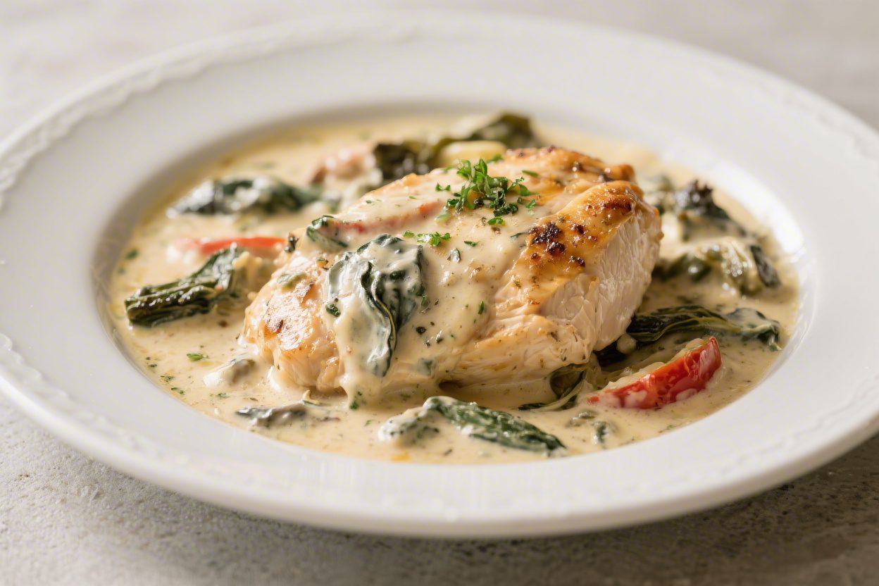 This Creamy Tuscan Chicken comes together in about half an hour, but it tastes like you simmered it all afternoon. Juicy pan-seared chicken swims in a garlicky Parmesan cream sauce with sun-dried tomatoes, spinach, and a touch of Italian herbs. It’s rich, comforting, and weeknight-friendly.